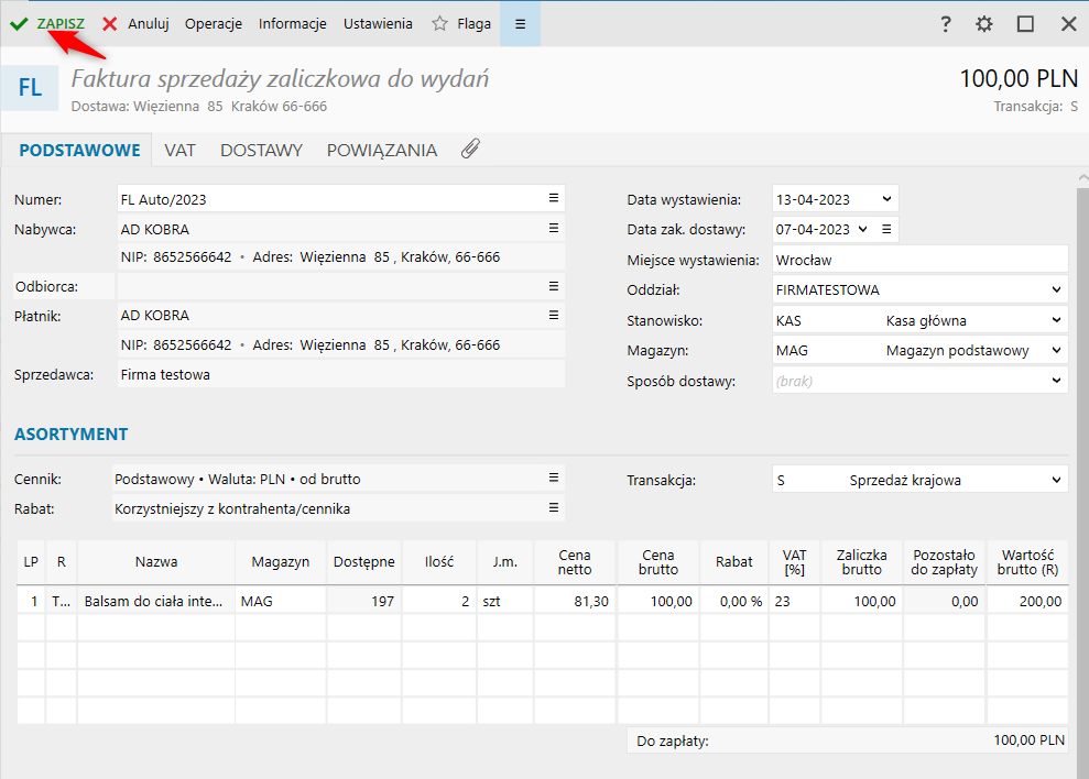 2. Uzupełnić dane dotyczące płatności i daty wystawienia dokumentu. Zapisać dokument.