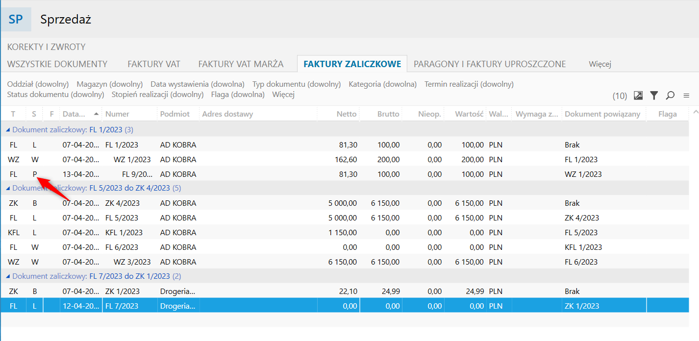 W widoku Faktur zaliczkowych wyświetlony zostanie dokument opatrzony odpowiednim statusem.