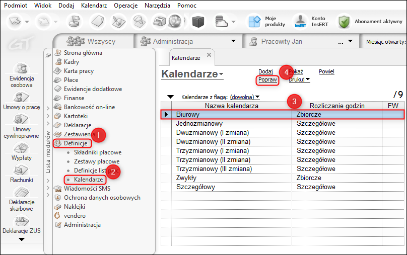 Od wersji 1.75 SP1 program Gratyfikant GT umożliwia uwzględnienie pracy zdalnej w cyklu pracy kalendarza. W celu modyfikacji kalendarza i wprowadzenia do niego pracy zdalnej należy: