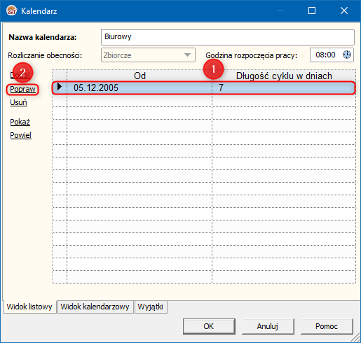 2. W oknie Kalendarz zaznaczyć cykl, w którym ma zostać ujęta praca zdalna i kliknąć opcję Popraw.