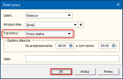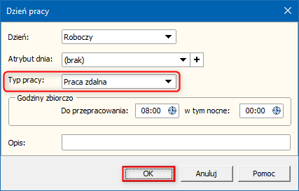 4. W oknie, które się wyświetli, w polu Typ pracy wybrać opcję Praca zdalna. Modyfikację zatwierdzić przyciskiem OK.