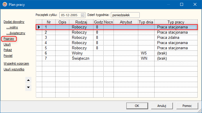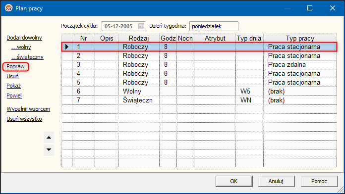3. W oknie Plan pracy zaznaczyć dzień cyklu, który ma być zdefiniowany jako praca zdalna i wybrać opcję Popraw.