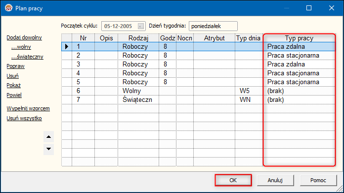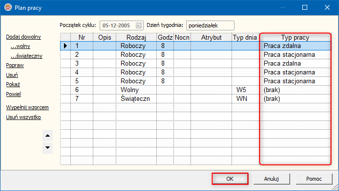 5. Po wprowadzeniu modyfikacji do poszczególnych dni zweryfikować poprawność cyklu. Do weryfikacji poprawności przydatna może się okazać kolumna Typ pracy. Plan pracy zapisać przyciskiem OK.