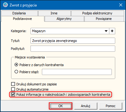 2. W oknie, które się wyświetli zaznaczyć opcję Pokaż informacje o należnościach i zobowiązaniach kontrahenta. Zmiany zapisać przyciskiem OK.
