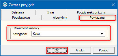 2. W oknie, które się wyświetli przejść na zakładkę Powiązane i wybrać domyślną Kategorię w sekcji Dokument kasowy. Zmiany zapisać przyciskiem OK.