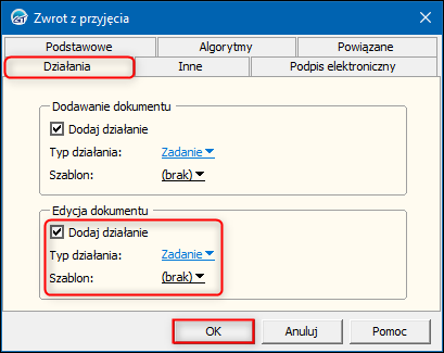 2. W oknie, które się wyświetli przejść na zakładkę Działania, a następnie w sekcji Edycja dokumentu zaznaczyć opcję Dodaj działanie. Następnie ustawić Typ działania, które ma zostać tworzone i opcjonalnie wskazać szablon. Zmiany zapisać przyciskiem OK.