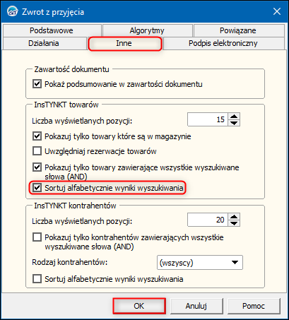 2. W oknie Zwrot z przyjęcia przejść na zakładkę Inne i zaznaczyć opcję Sortuj alfabetycznie wyniki wyszukiwania w sekcji InsTYNKT towarów. Zmiany zapisać przyciskiem OK.