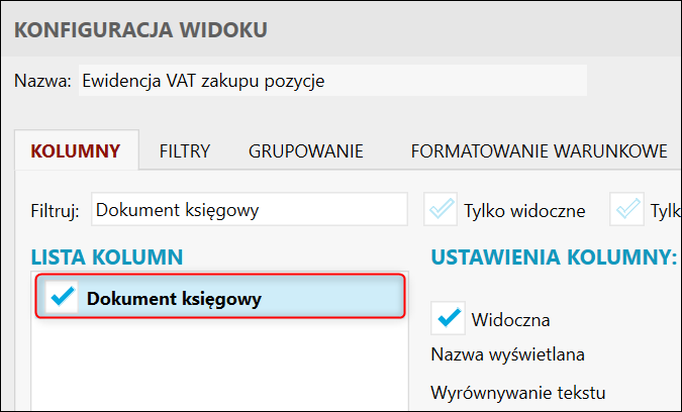 Rewizor nexo – Jak do widoku Ewidencji VAT zakupu dodać kolumnę Dokument księgowy?