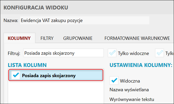 Rewizor nexo – Jak do widoku Ewidencji VAT zakupu dodać kolumnę Posiada zapis skojarzony?
