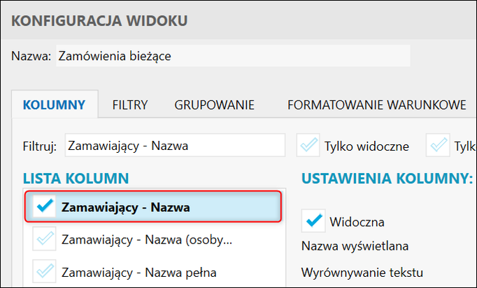 Aby pokazać kolumnę Zamawiający – Nazwa, należy: