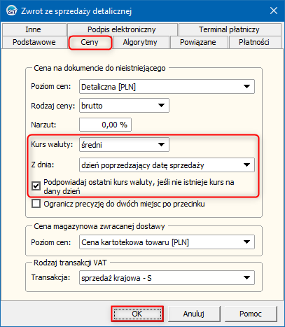 2. W oknie, które się wyświetli przejść na zakładkę Ceny i ustawić parametry dotyczące kursów walut: