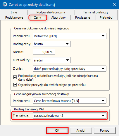 2. W oknie, które się wyświetli przejść na zakładkę Ceny i wybrać domyślny Rodzaj transakcji VAT. Zmiany zapisać przyciskiem OK.