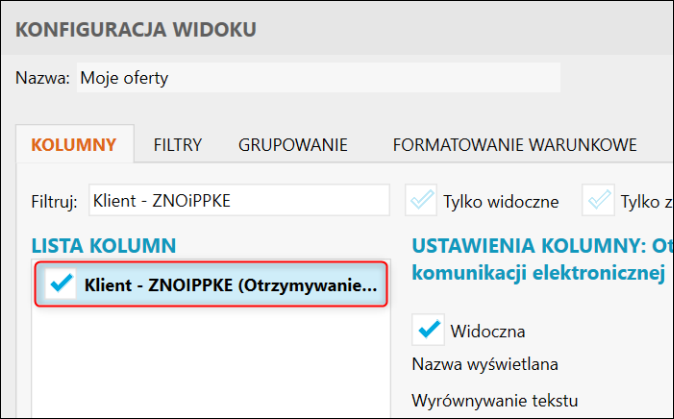 Gestor nexo – Jak do widoku Ofert dodać kolumnę Klient – ZNOiPPKE (Otrzymywanie informacji przy pomocy komunikacji elektronicznej)?