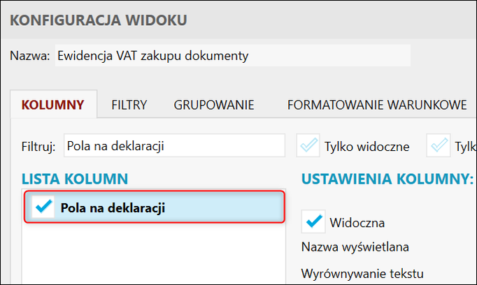 Rewizor nexo – Jak do widoku Ewidencji VAT zakupu dodać kolumnę Pola na deklaracji?