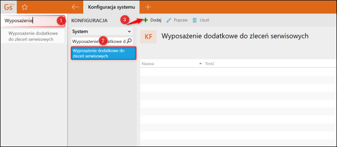 1. Przejść do modułu Konfiguracja – Dodatkowe wyposażenie dla zleceń serwisowych i z górnego menu wybrać Dodaj.