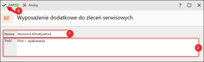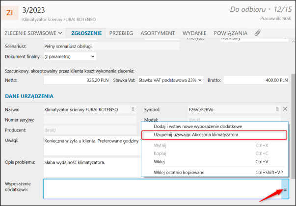 W formatce zlecenia serwisowego użytkownik może uzupełnić informacje o dodatkowym wyposażeniu serwisowanego urządzenia. Aby zdefiniować dodatkowe wyposażenie urządzeń, należy: