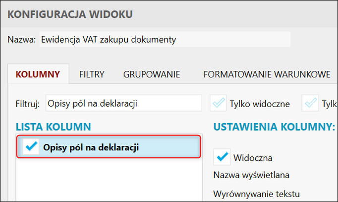 Rewizor nexo – Jak do widoku Ewidencji VAT zakupu dodać kolumnę Opisy pól na deklaracji?