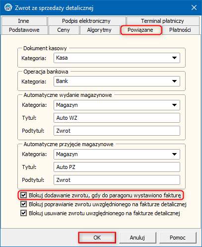 2. W oknie, które się wyświetli przejść na zakładkę Powiązane i zaznaczyć opcję Blokuj dodawanie zwrotu, gdy do paragonu wystawiono fakturę. Zmiany zapisać przyciskiem OK.
