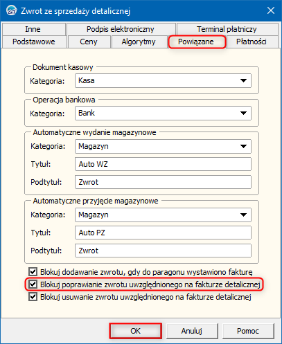 2. W oknie, które się wyświetli przejść na zakładkę Powiązane i zaznaczyć opcję Blokuj poprawianie zwrotu uwzględnionego na fakturze detalicznej. Zmiany zapisać przyciskiem OK.