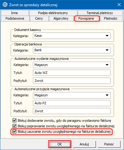 2. W oknie, które się wyświetli przejść na zakładkę Powiązane i zaznaczyć opcję Blokuj usuwanie zwrotu uwzględnionego na fakturze detalicznej. Zmiany zapisać przyciskiem OK.