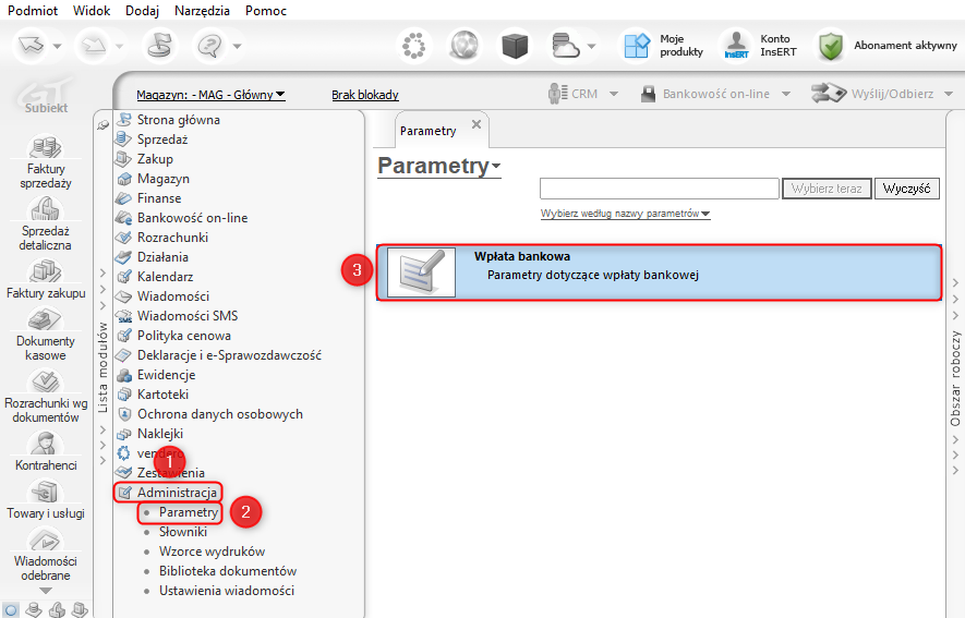 1. Z listy modułów wybrać Administracja – Parametry, a z listy parametrów Wpłata bankowa.
