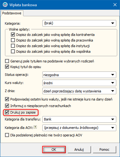 2. W oknie, które się wyświetli zaznaczyć opcję Drukuj po zapisie. Zmiany zapisać przyciskiem OK.