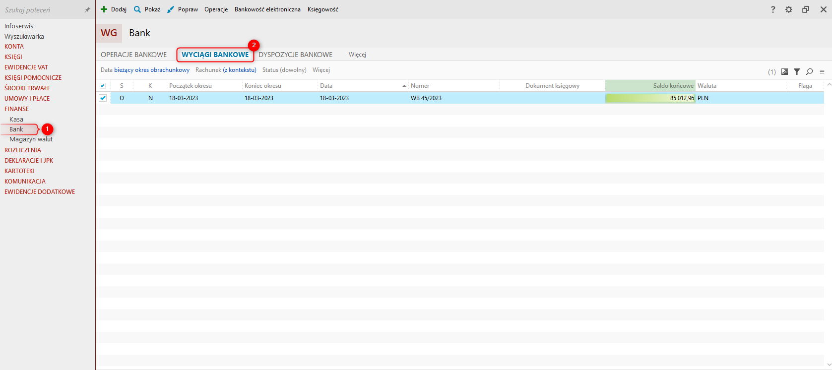 Aby dodać wyciąg bankowy, należy przejść do modułu Bank i widoku Wyciągi bankowe, który pozwala ewidencjonować wyciągi bankowe.