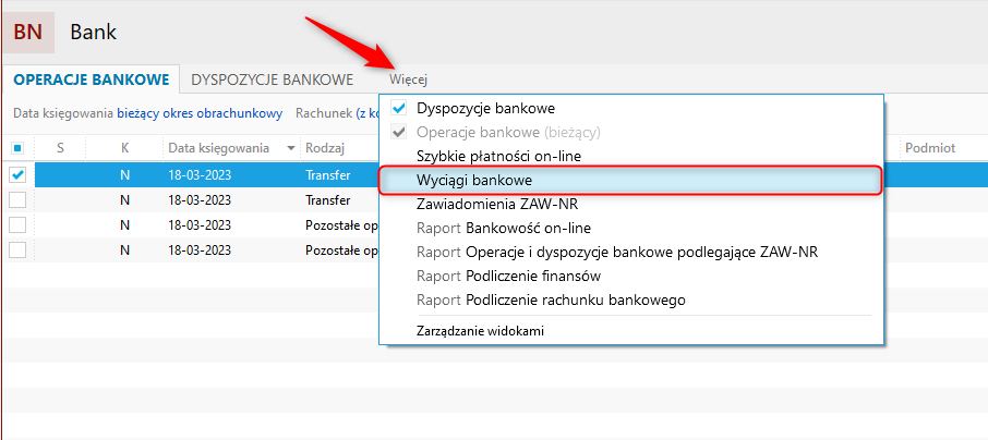 W sekcji Operacje prezentowane są wszystkie operacje bankowe, które wchodzą w skład wyciągu. W menu kontekstowym znajdują się operacje, które można wykonać na pozycji wyciągu.
