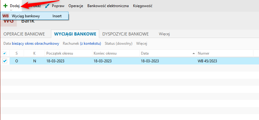 Z górnego menu wybrać Dodaj – Wyciąg bankowy.