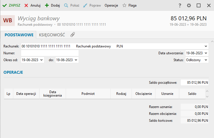 Sekcja ta pozwala również na podanie salda początkowego wyciągu – saldo końcowe wyliczone zostanie automatycznie na podstawie salda początkowego oraz operacji z wyciągu.