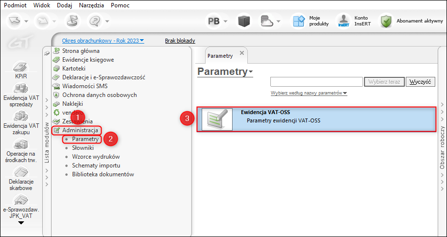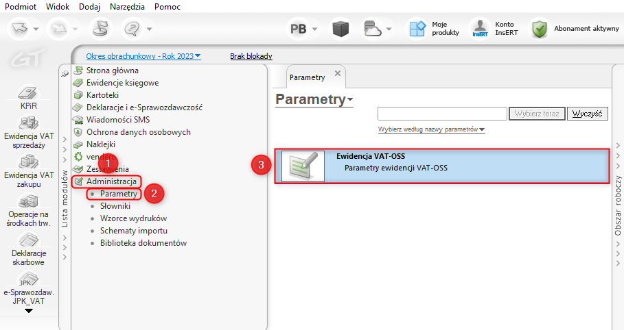 1. Z listy modułów wybrać Administracja – Parametry, a z listy parametrów Ewidencja VAT-OSS.