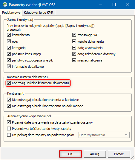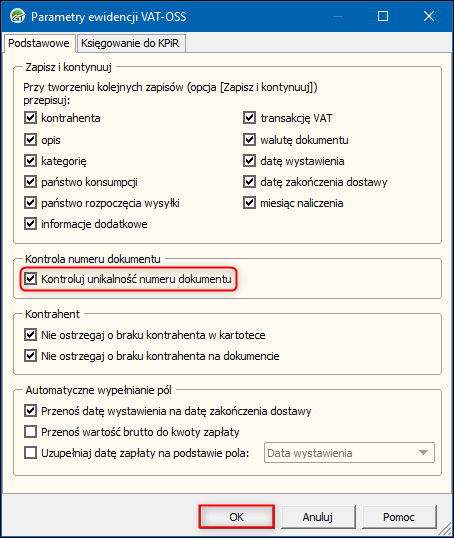 2. W oknie, które się wyświetli zaznaczyć opcję Kontroluj unikalność numeru dokumentu. Zmiany zapisać przyciskiem OK.