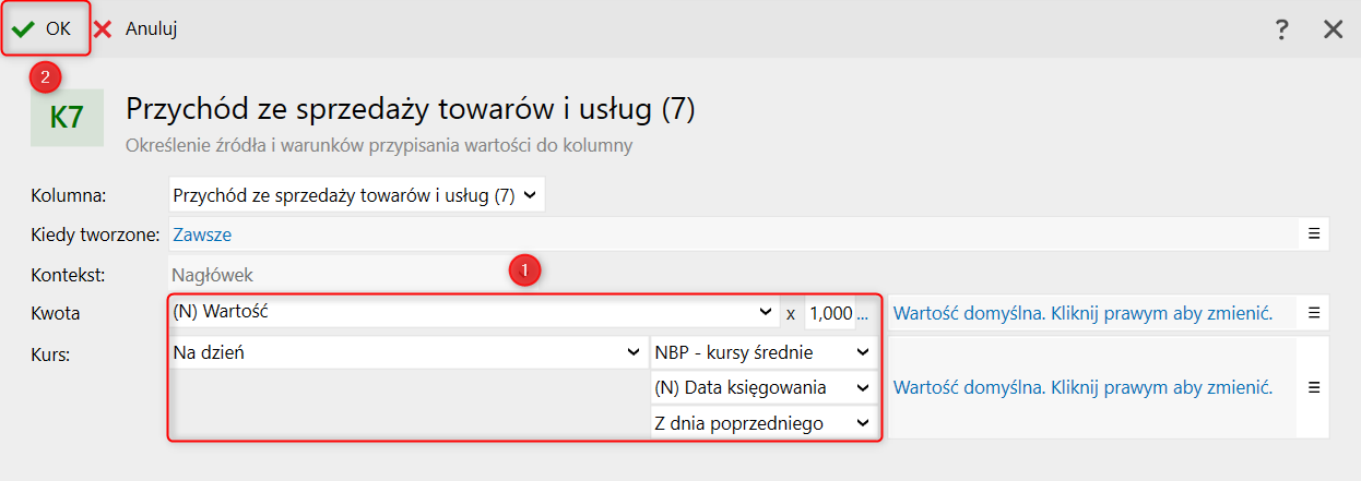 5. Wybrać Kolumnę, w której powinna pojawić się kwota z operacji bankowej.