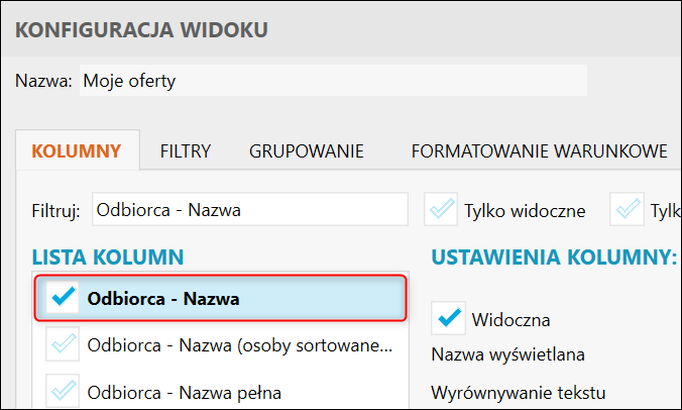 Gestor nexo – Jak do widoku Ofert dodać kolumnę Odbiorca – Nazwa?