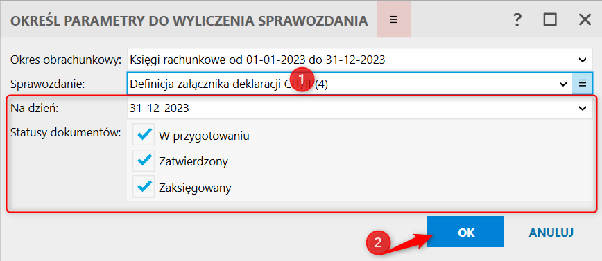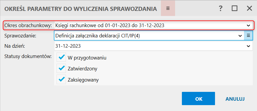 4. W polu Na dzień określić, z jakiego okresu dokumenty księgowe będą uwzględniane podczas wyliczania CIT/IP. Określić Statusy dokumentów uwzględniane podczas wyliczania CIT/IP.
