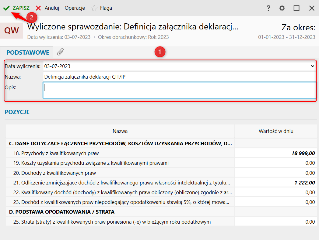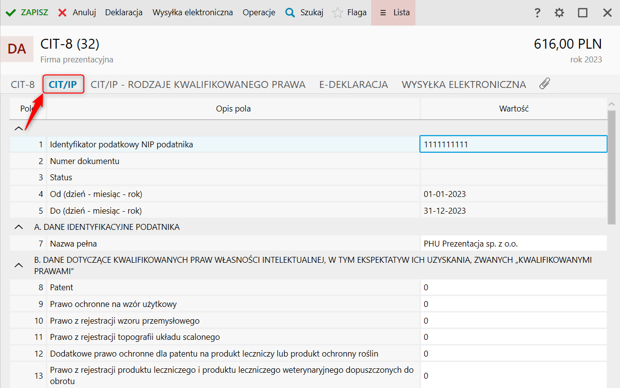 Po wyliczeniu deklaracji CIT-8, załącznik CIT/IP dodany zostanie automatycznie.