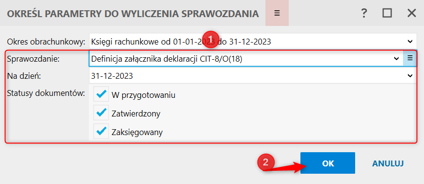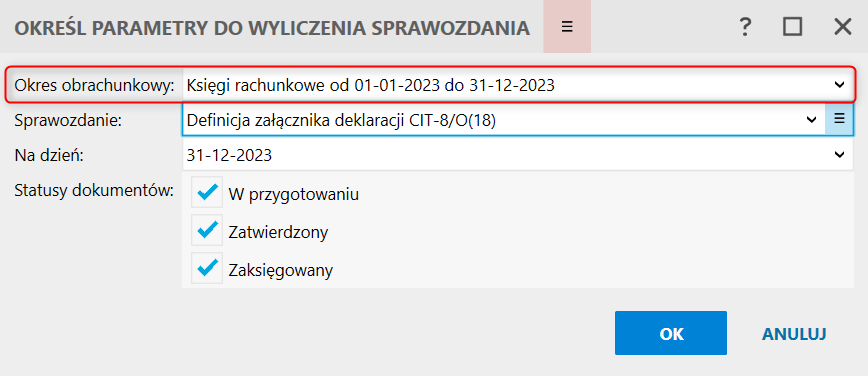 4. W polu Na dzień określić, z jakiego okresu dokumenty księgowe będą uwzględniane podczas wyliczania CIT-8/O. Określić Statusy dokumentów uwzględniane podczas wyliczania CIT-8/O