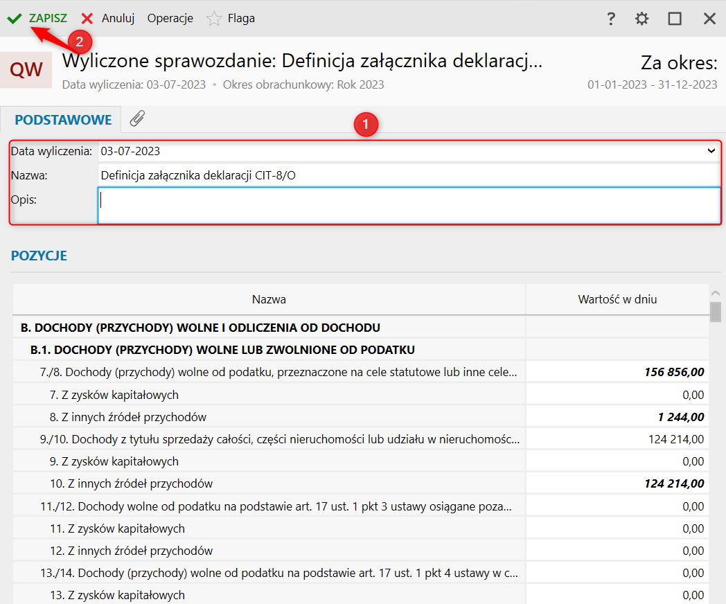 Uwaga! W przypadku, gdy wartości na wyliczonym sprawozdaniu nie są poprawne należy w pierwszej kolejności odpowiednio zdefiniować CIT-8/O. Artykuł opisujący definiowanie składników i struktury sprawozdań znajduje się tutaj.