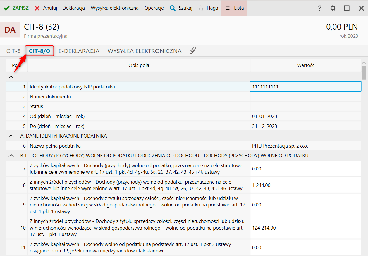 Po wyliczeniu deklaracji CIT-8, załącznik CIT-8/O​ dodany zostanie automatycznie.