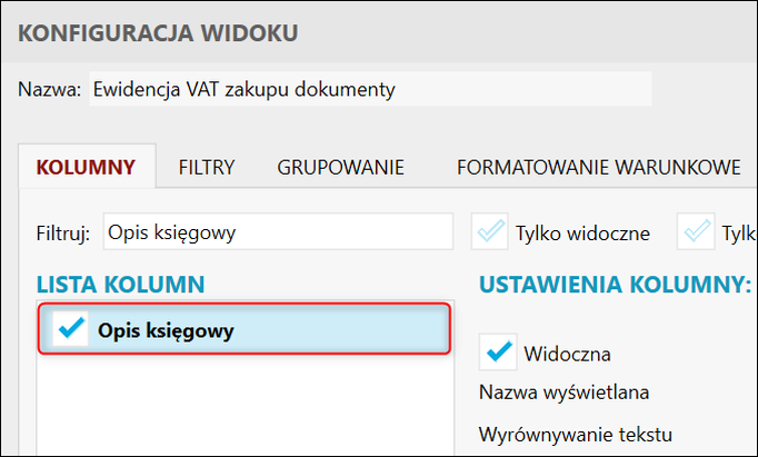 Rewizor nexo – Jak do widoku Ewidencji VAT zakupu dodać kolumnę Opis księgowy?