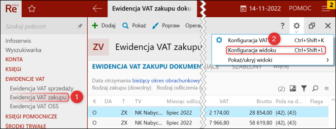 1. Przejść na zakładkę Ewidencja VAT zakupu, rozwinąć menu koła zębatego w górnym menu i wybrać Konfiguracja widoku.