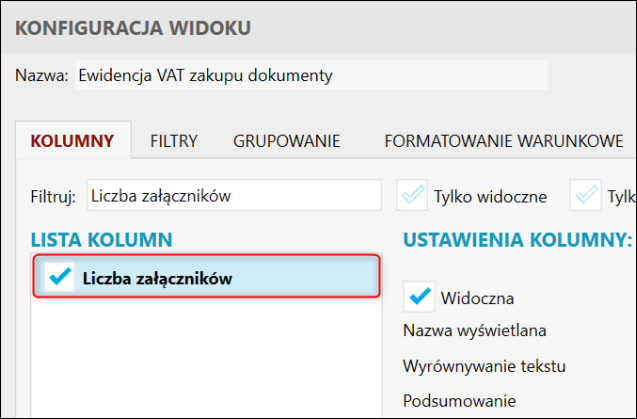 Rewizor nexo – Jak do widoku Ewidencji VAT zakupu dodać kolumnę Liczba załączników?