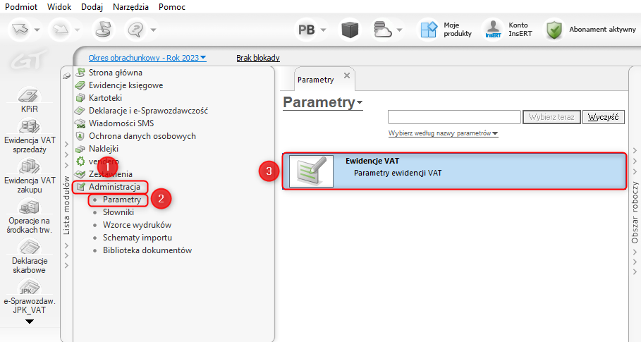 1. Z listy modułów wybrać Administracja – Parametry, a z listy parametrów Ewidencje VAT.