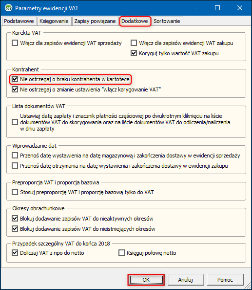 2. W oknie, które się wyświetli przejść na zakładkę Dodatkowe i zaznaczyć opcję Nie ostrzegaj o braku kontrahenta w kartotece. Zmiany zapisać przyciskiem OK.