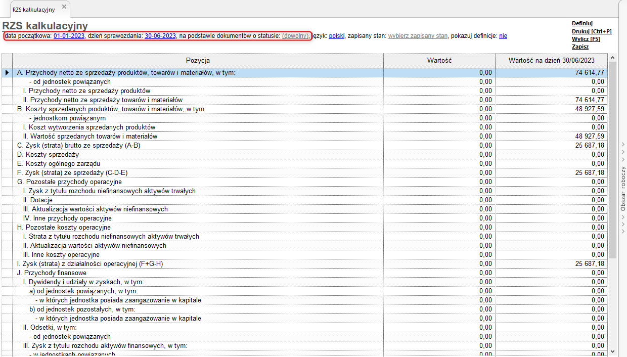 2. Określić dane takie jak: data i dzień sprawozdania, wskazać status dokumentów wchodzących do wyliczenia RZiS.