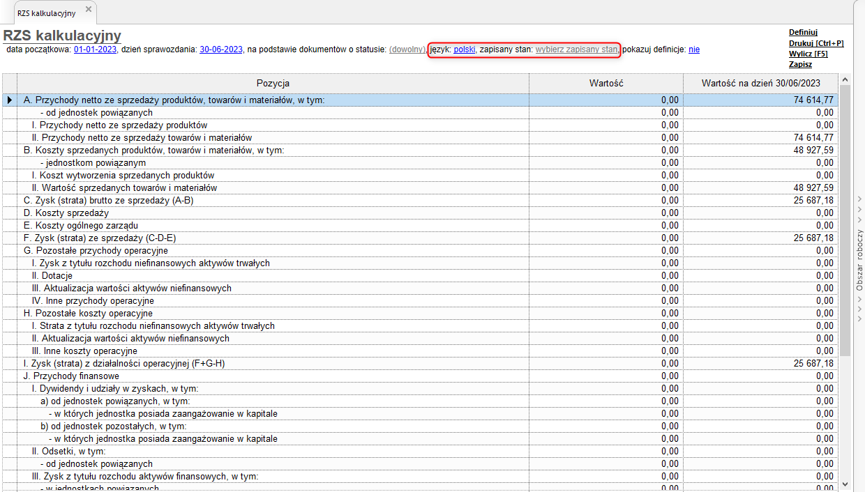3. Wybrać język sprawozdania. Następnie wybrać zapisany stan, który pozwala wskazać okres porównawczy sprawozdania.