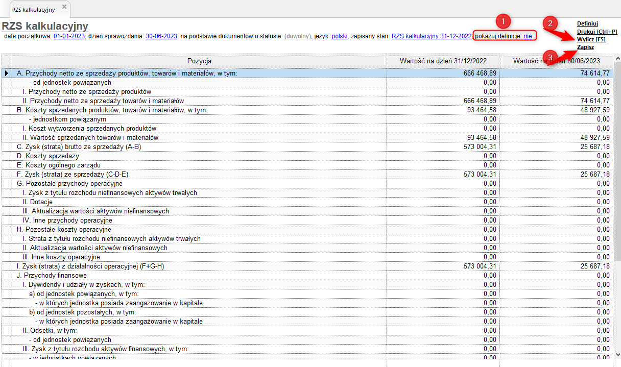 Uwaga! W przypadku, gdy wyliczone wartości odbiegają od oczekiwanych należy zweryfikować definicję RZiS. Proces definiowania RZiS opisany jest w artykule e-Pomocy technicznej: Rewizor GT – Jak dodać definicję RZiS?