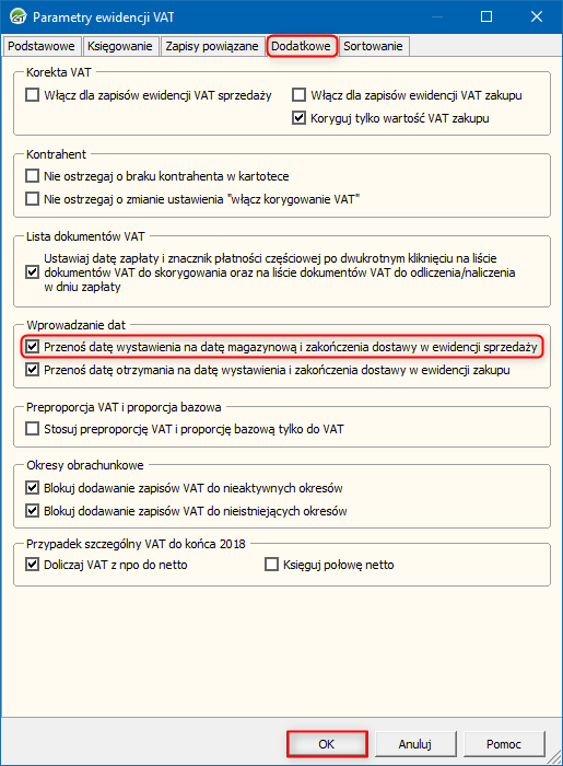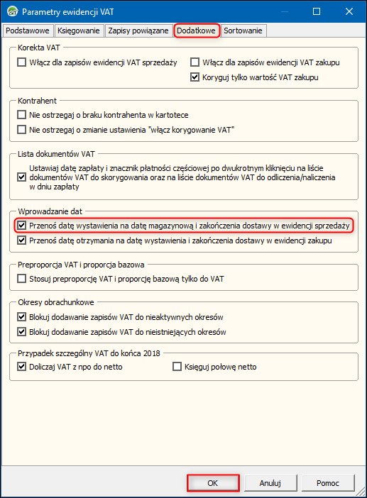 2. W oknie, które się wyświetli zaznaczyć opcję Przenoś datę wystawienia na datę magazynową i zakończenia dostawy w ewidencji sprzedaży w sekcji Wprowadzanie dat. Zmiany zapisać przyciskiem OK.