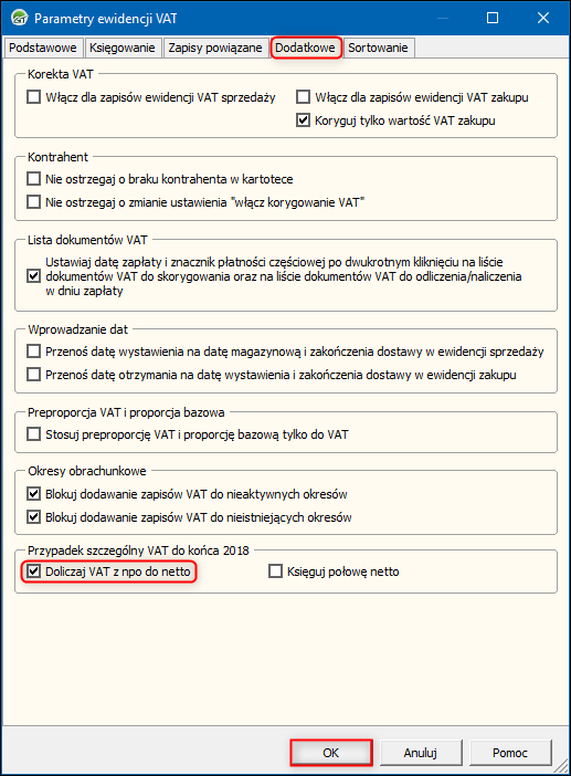 2. W oknie, które się wyświetli przejść na zakładkę Dodatkowe i zaznaczyć opcję Doliczaj VAT z npo do netto w sekcji Przypadek szczególny do końca 2018. Zmiany zapisać przyciskiem OK.