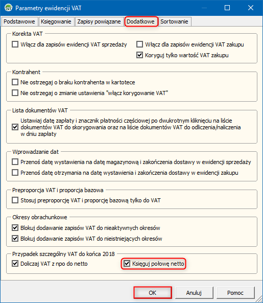 2. W oknie, które się wyświetli przejść na zakładkę Dodatkowe i zaznaczyć opcję Księguj połowę netto w sekcji Przypadek szczególny VAT do końca 2018. Zmiany zapisać przyciskiem OK.
